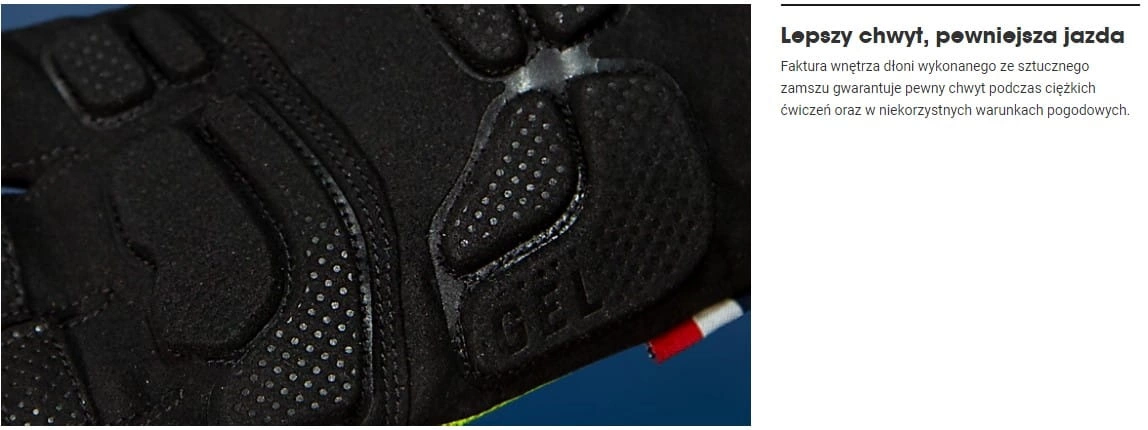 - Część rękawiczki na wewnętrzną część dłoni, którą wykonano z materiału imitującego zamsz, gwarantuje dużą wytrzymałość i odpowiednią teksturę dla zachowania przyczepności