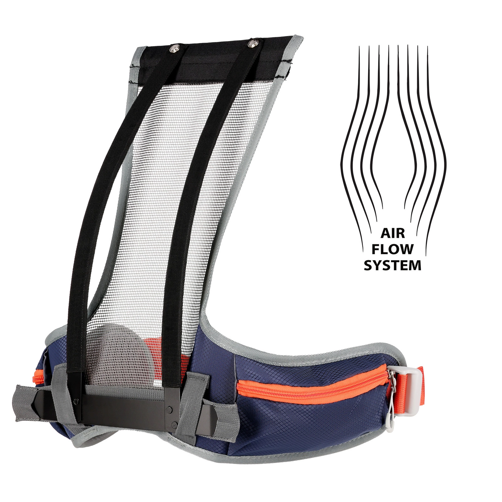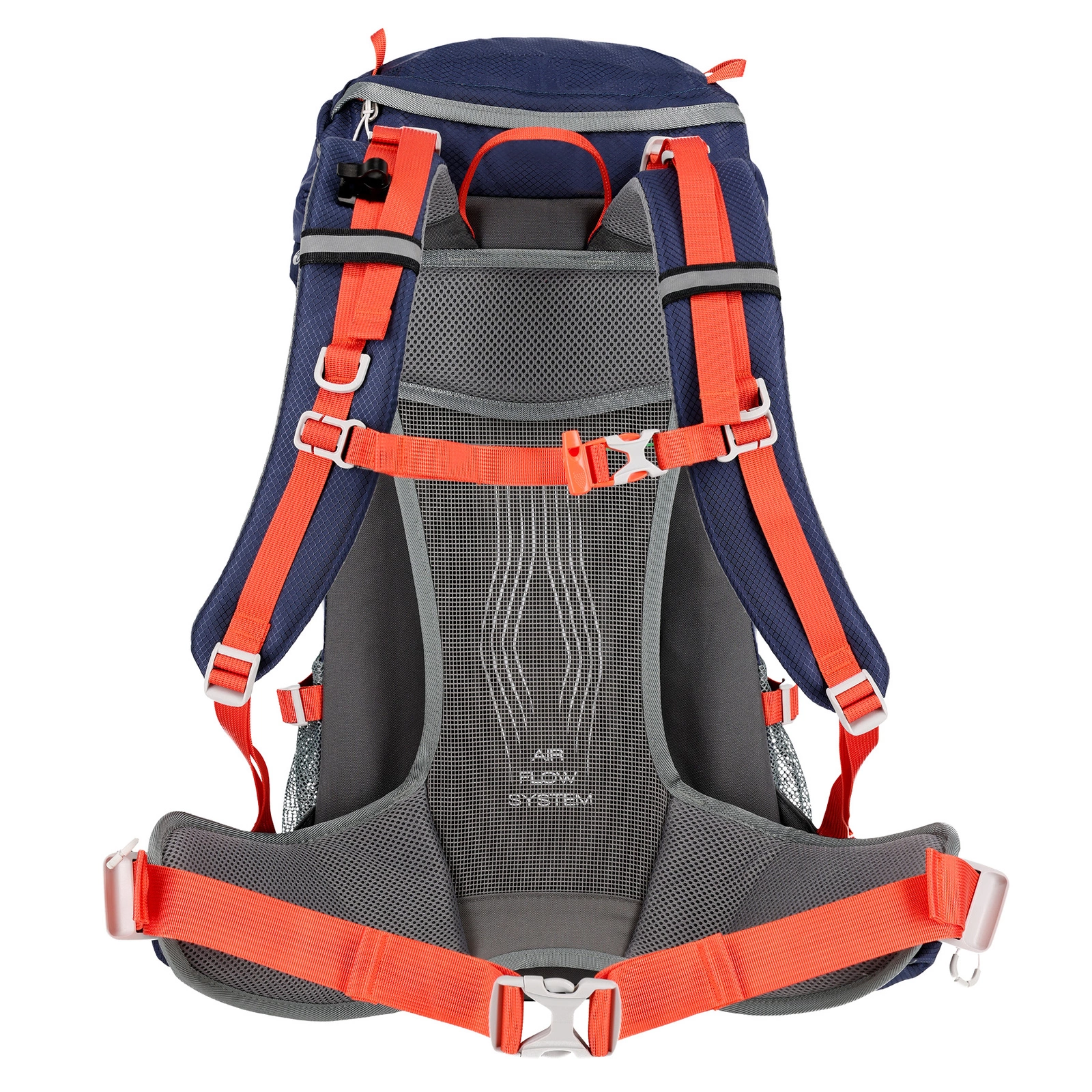 Na klamrze spinającej pas piersiowy umieszczono zintegrowany gwizdek ratunkowy, zwiększający bezpieczeństwo użytkownika. Dodatkowy panel uchwytów pozwala na zamocowanie np. kijków trekkingowych lub innych akcesoriów. Plecak posiada również dwie kieszenie boczne z siatki oraz kieszenie na zamek w pasie biodrowym, idealne na telefon czy inne drobne przedmioty.