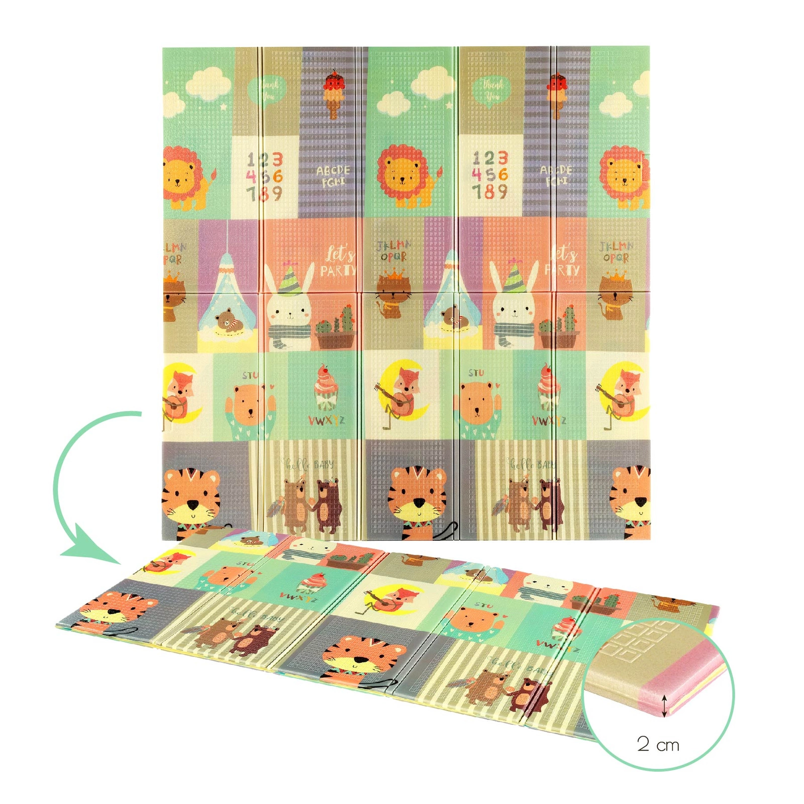 Mata nie tylko służy do zabawy, ale również jest narzędziem edukacyjnym. Z wypukłymi cyframi i literami, które pomagają w nauce czytania, oraz z ilustracjami misia, tygrysa, koali i innych zwierząt, wspiera rozwój sensoryczny i poznawczy Twojego dziecka. Dwustronna konstrukcja maty pozwala na zmianę scenerii, co zapewnia różnorodność stymulacji i utrzymuje zainteresowanie dziecka.