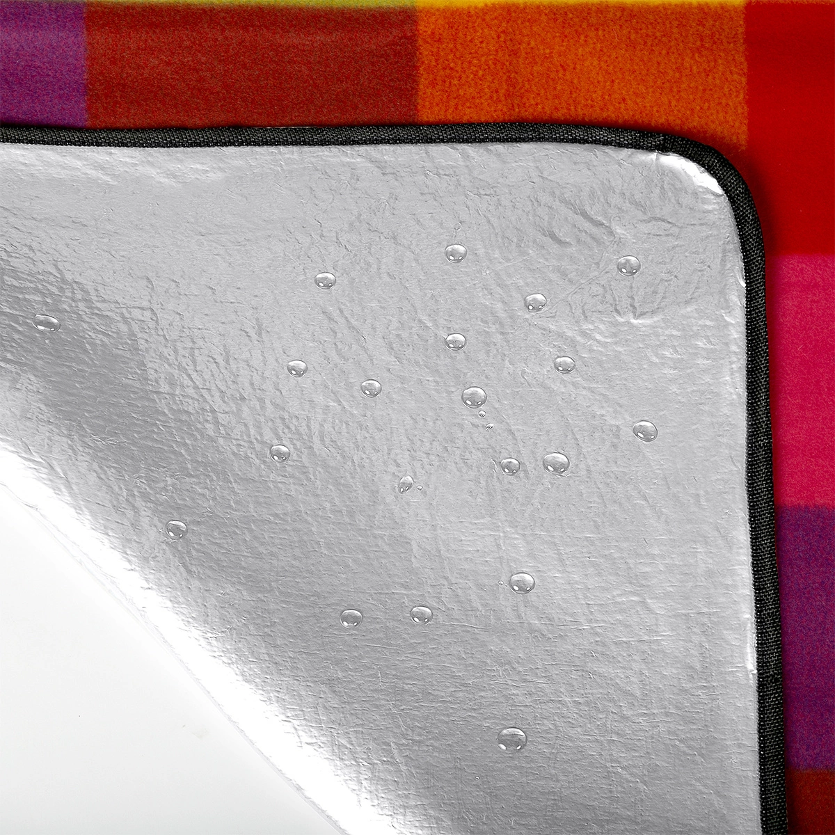 Koc został wykonany z dwóch warstw materiału. Górna to wysokiej jakości pianka, cechująca się miękkością i dobrą ochroną przed chłodniejszym podłożem, co zdecydowanie poprawia komfort użytkowania. Na dolnej części, umieszczono powłokę aluminium, które jest wodoodporne i pozwala użyć koca np. na wilgotnym piasku, czy trawie pokrytej rosą. W połączeniu, oba te materiały, tworzą świetną warstwę termoizolacyjną.
