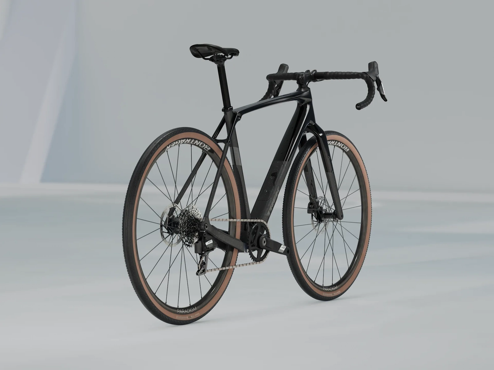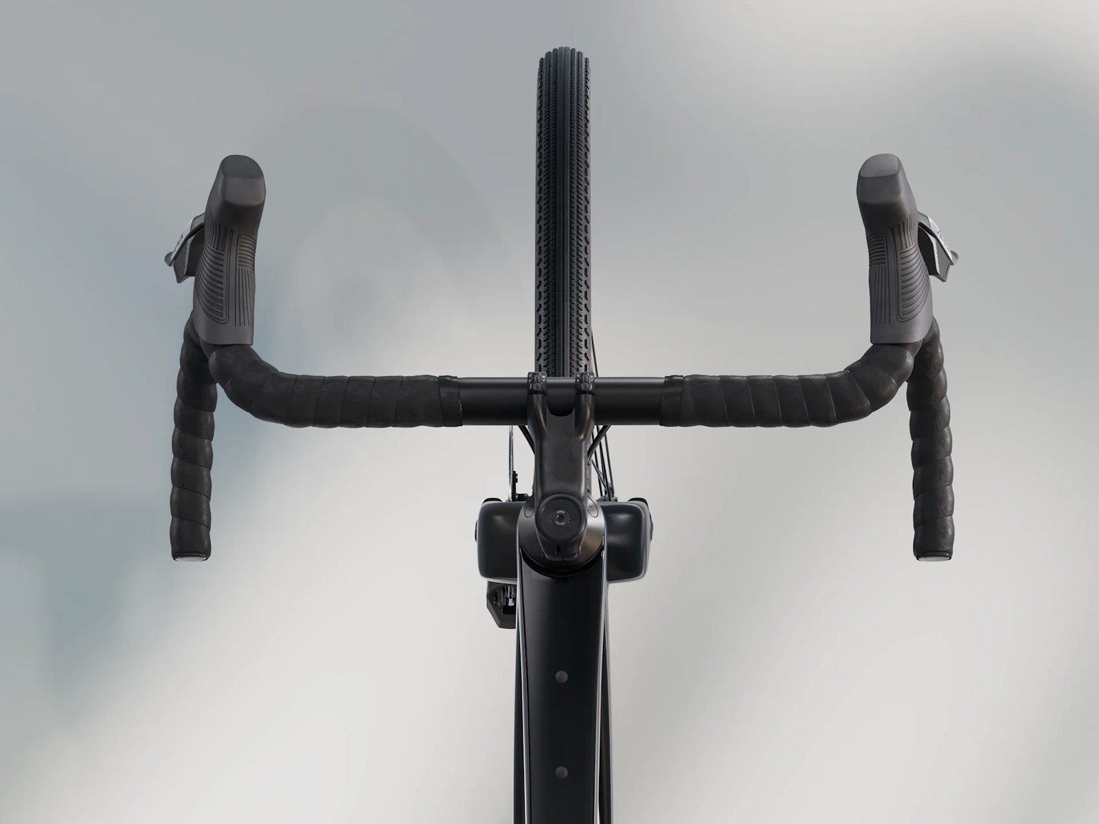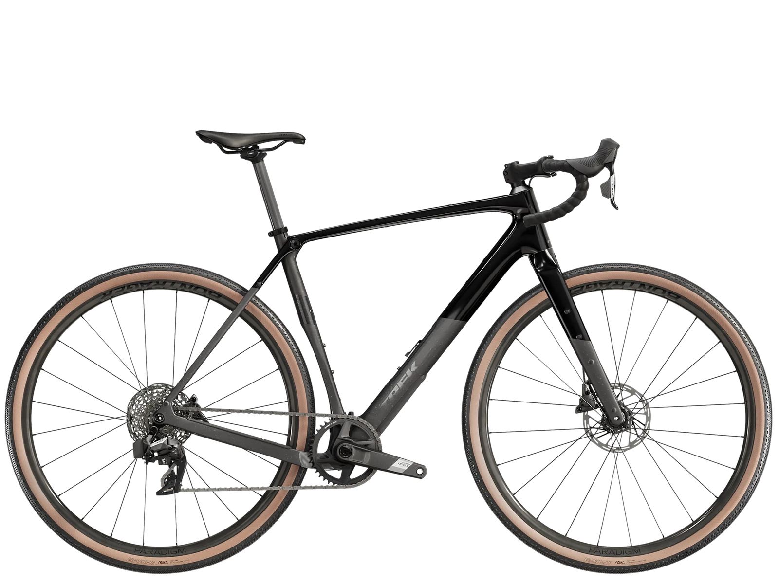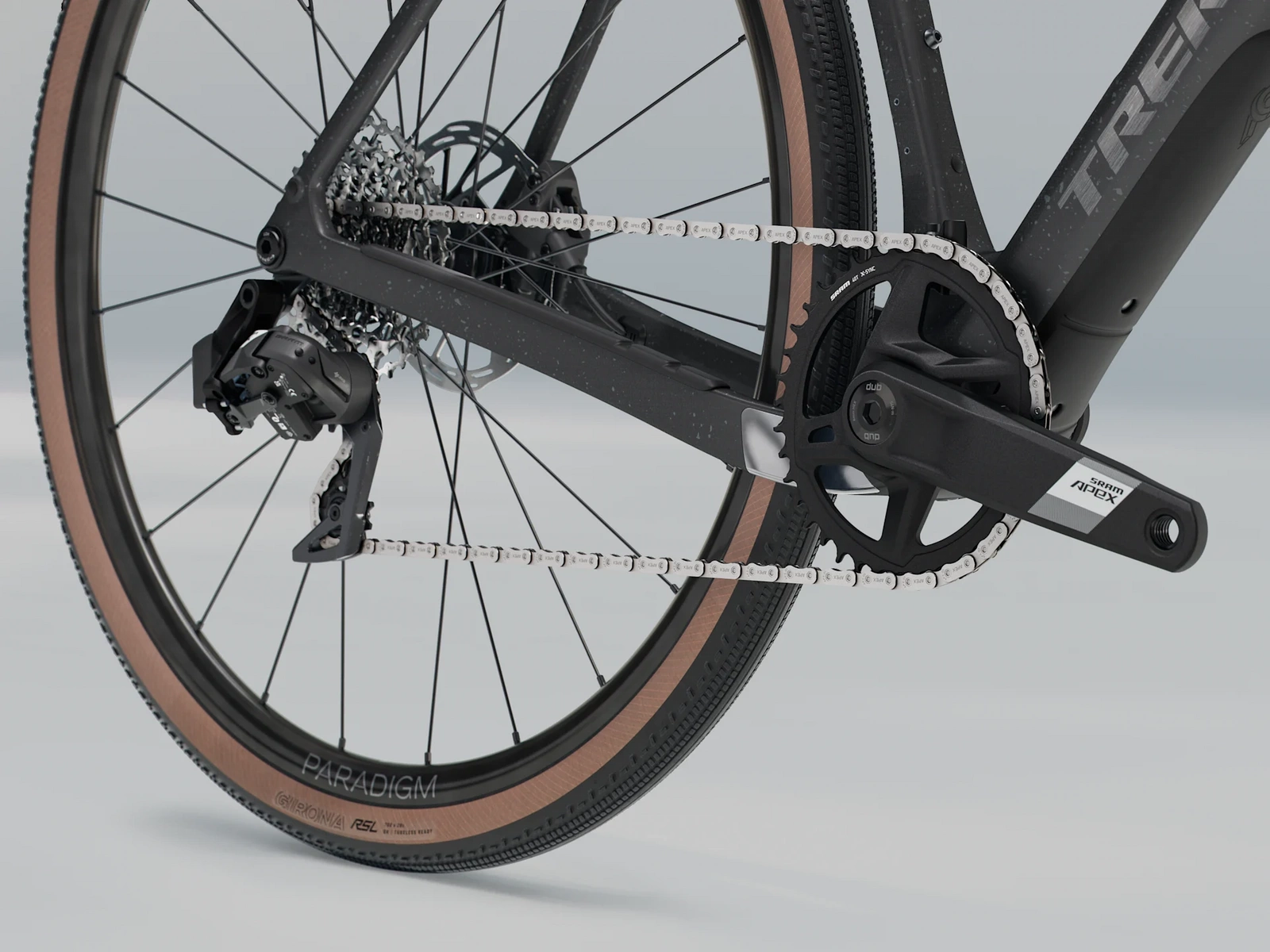 Rama z włókna węglowego OCLV Serii 500 z widelcem z włókna węglowego, schowek w rurze dolnej, prześwit na opony 50 mm (zgodnie z pomiarem). Całkowicie bezprzewodowy napęd 1x12 SRAM Apex XPLR AXS, hydrauliczne hamulce tarczowe, sztyca podsiodłowa z włókna węglowego oraz opony Bontrager Paradigm SL gotowe na montaż bezdętkowy z oponami 42 mm.