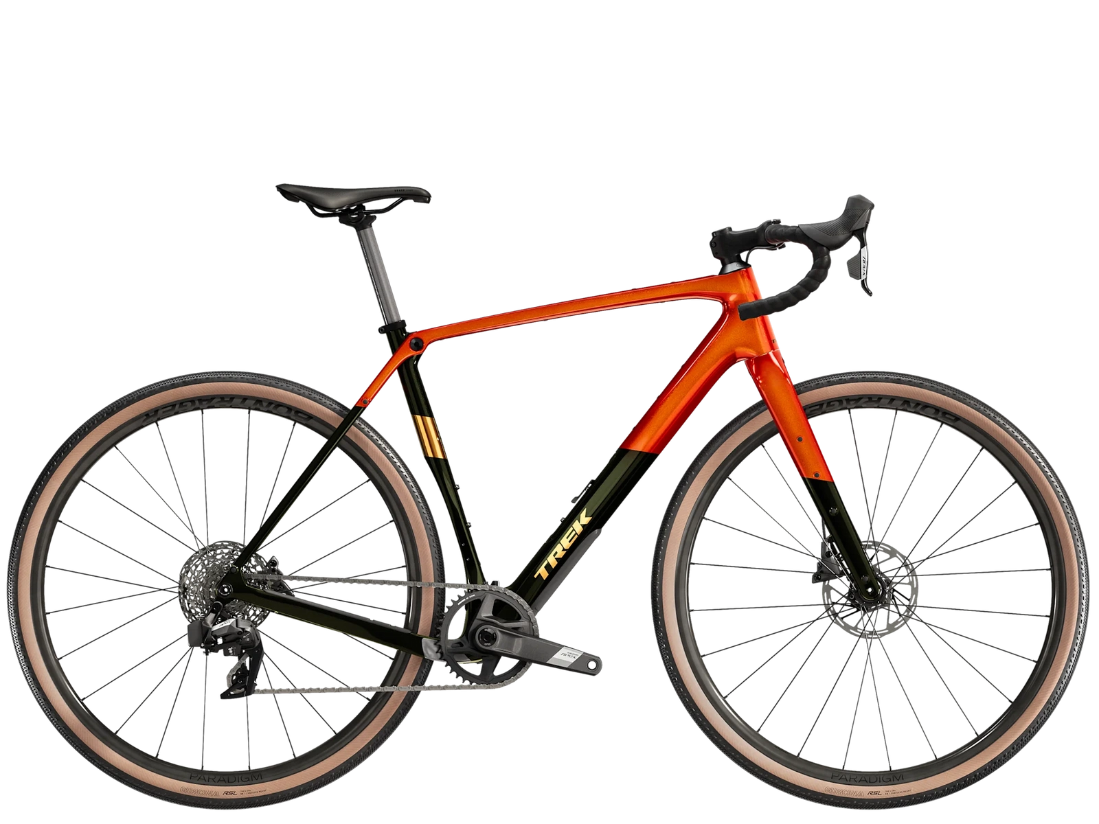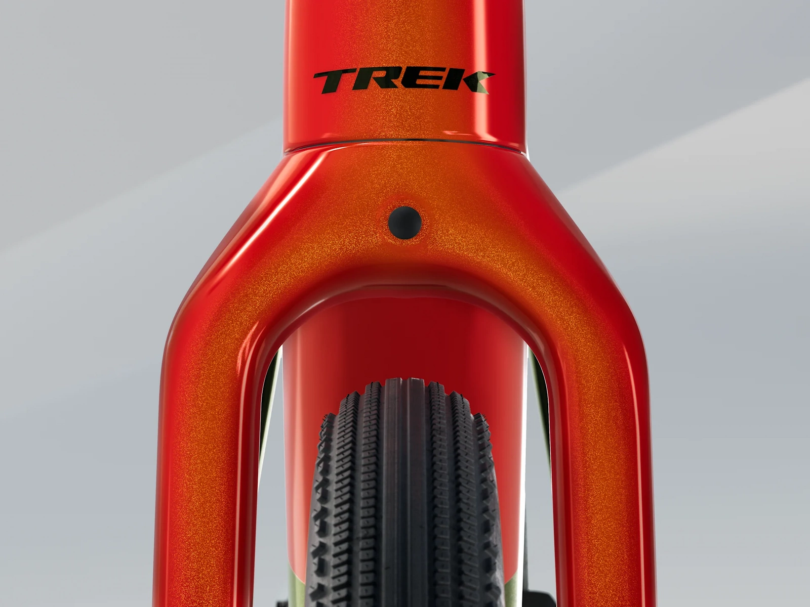 Rama z włókna węglowego OCLV Serii 500 z widelcem z włókna węglowego, schowek w rurze dolnej, prześwit na opony 50 mm (zgodnie z pomiarem). Całkowicie bezprzewodowy napęd 1x12 SRAM Apex XPLR AXS, hydrauliczne hamulce tarczowe, sztyca podsiodłowa z włókna węglowego oraz opony Bontrager Paradigm SL gotowe na montaż bezdętkowy z oponami 42 mm.