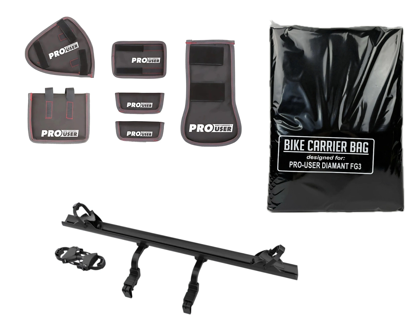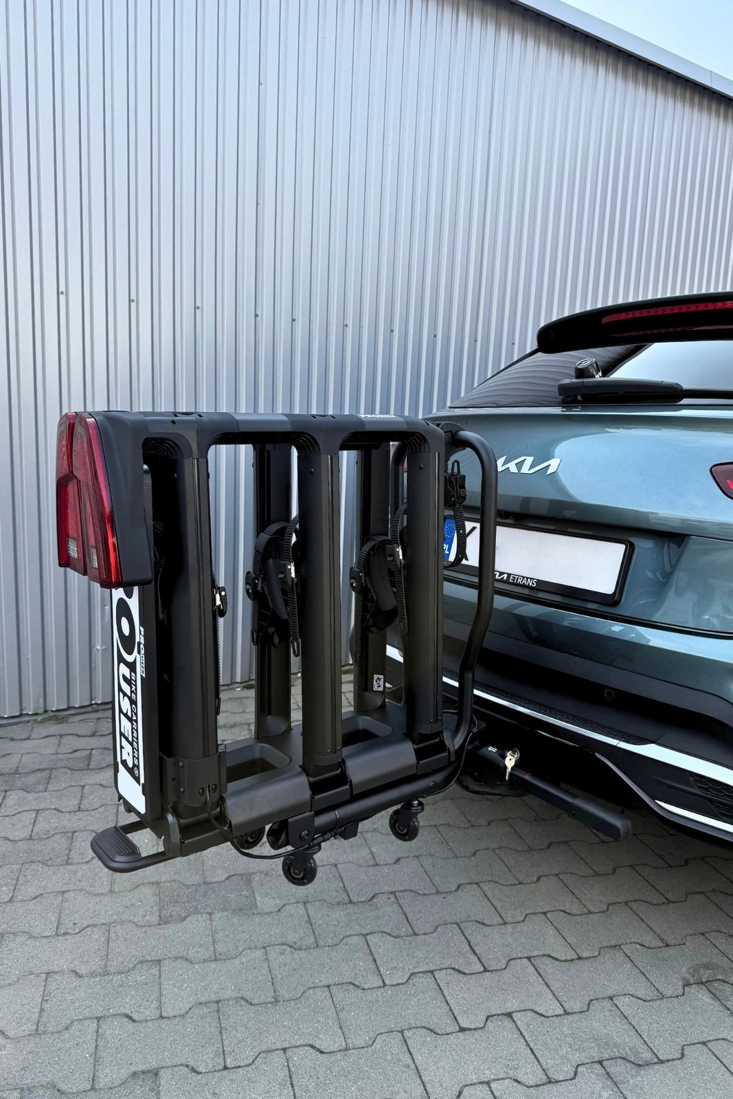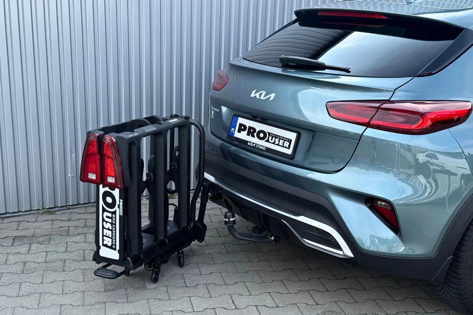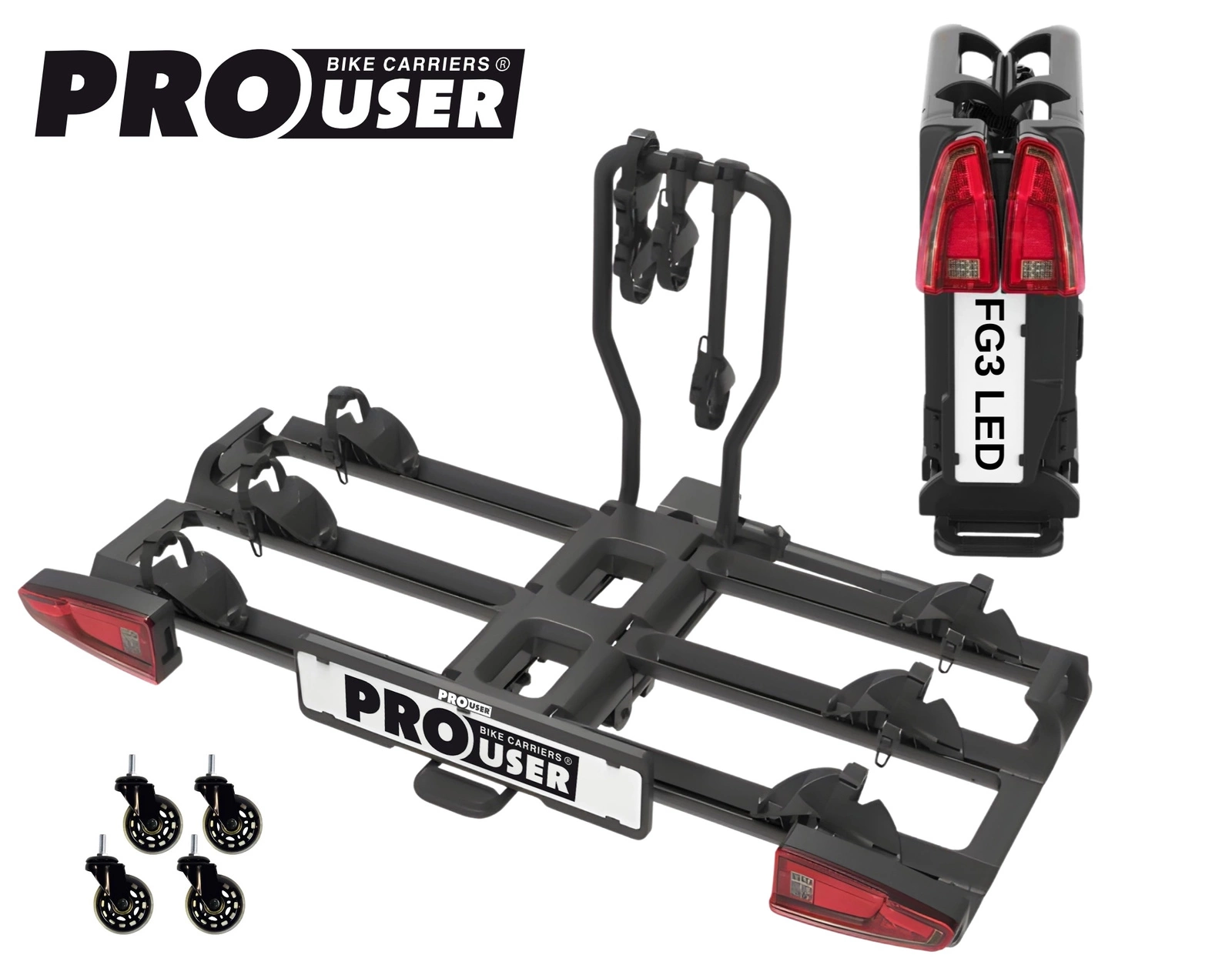 Bagażnik na rowery na hak PROUSER Diamant FG3 Black z rewelacyjnym oświetleniem DYNAMIC LED i kółkami transportowymi w cenie! Maksymalna ładowność: 60 kg - Świetnie nadaje się do przewozu rowerów elektrycznych.