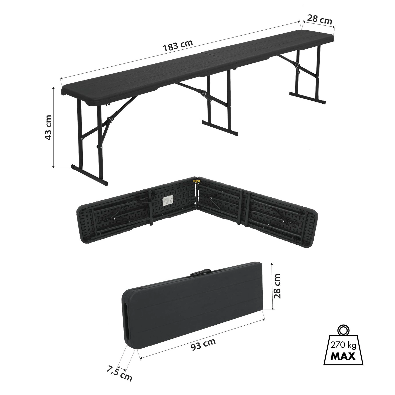 Pomimo niskiej wagi, ława NC3404 charakteryzuje się wyjątkową stabilnością i solidnością. Maksymalne obciążenie aż 270 kg pozwala na bezpieczne użytkowanie przez kilka osób jednocześnie. Z długością 183 cm zapewnia dużo miejsca do siedzenia przy stole, a wysokość 43 cm doskonale współgra ze standardowymi stołami piknikowymi i cateringowymi.