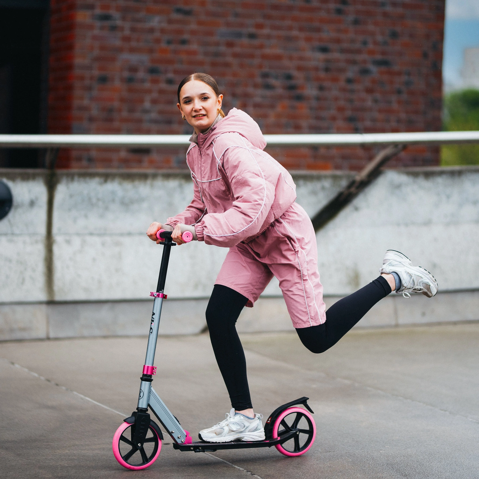 Płynna i komfortowa jazda Dzięki zastosowaniu dużych, poliuretanowych kółek o średnicy 200 mm oraz wysokiej klasy łożysk ABEC 7, hulajnoga zapewnia płynną jazdę nawet po nierównych nawierzchniach. Doskonale sprawdzi się zarówno na asfalcie, jak i wybrukowanych chodnikach, gwarantując komfort i minimalizując drgania.