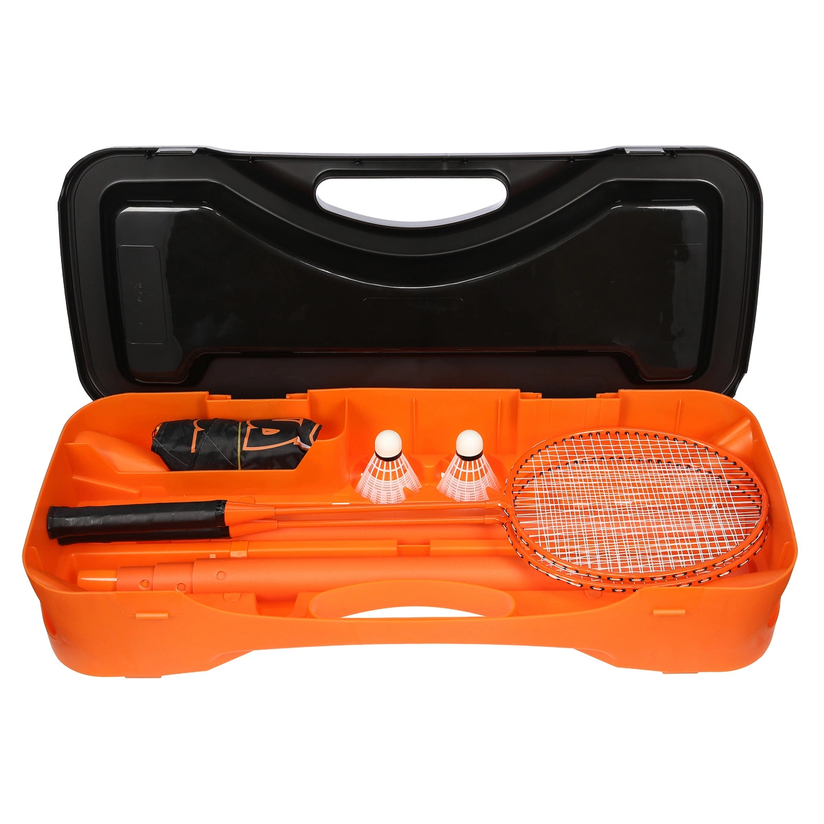 Zestaw znajduje się w plastikowym pudełku, które służy także jako podstawa siatki. Konstrukcja opiera się na dwóch słupkach teleskopowych. Dla optymalnego rozciągnięcia siatkę do badmintona należy umieścić na wysokości 155 cm.