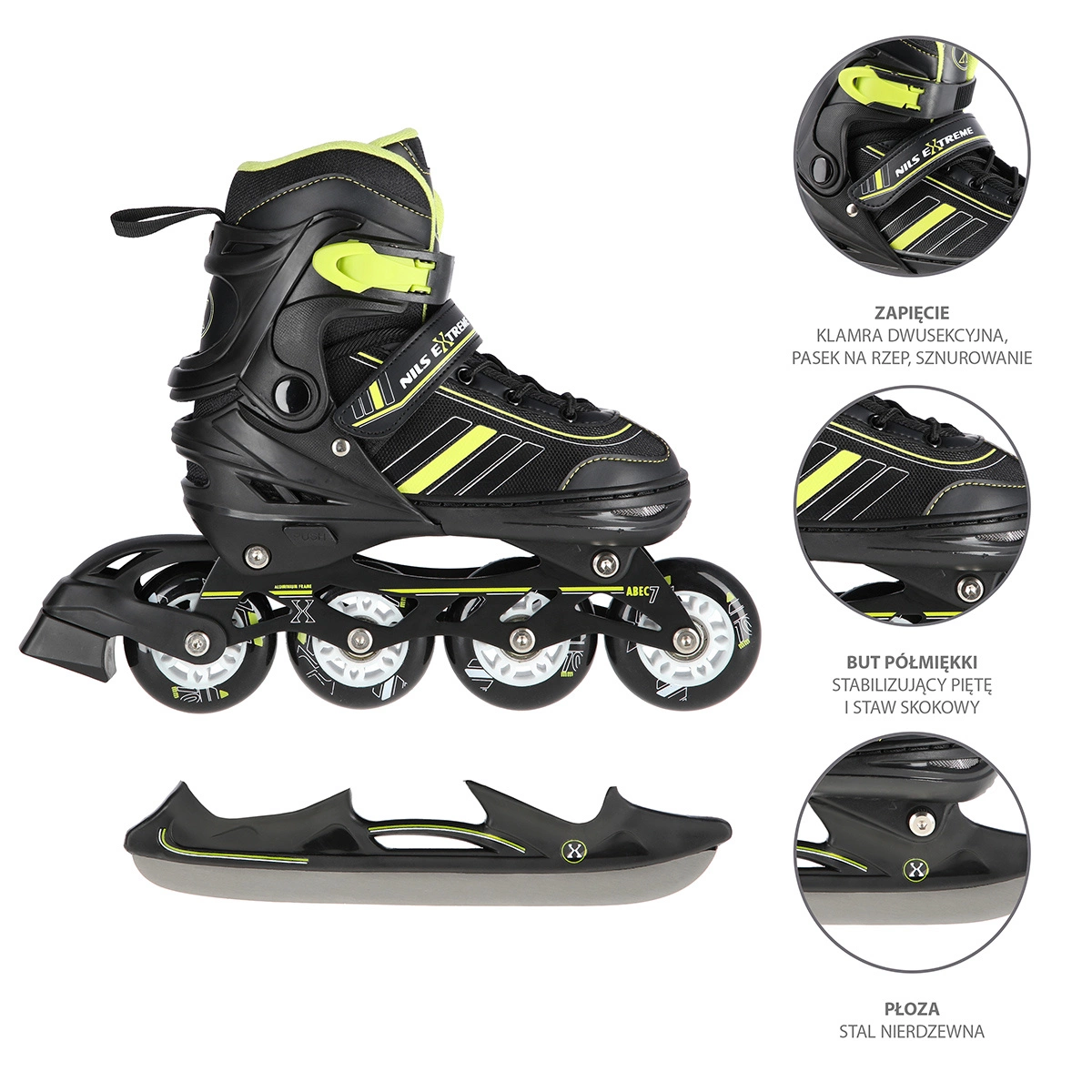 Łyżworolki NH18191 Nils Extreme, to produkt przeznaczony dla pasjonatów jazdy. Oferuje 2 możliwości konfiguracji. Są to: łyżwy, łyżworolki.