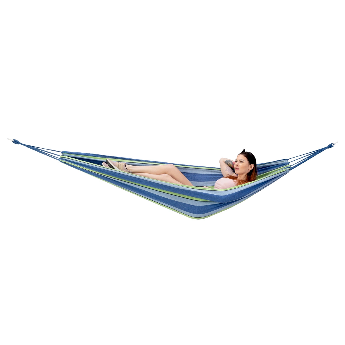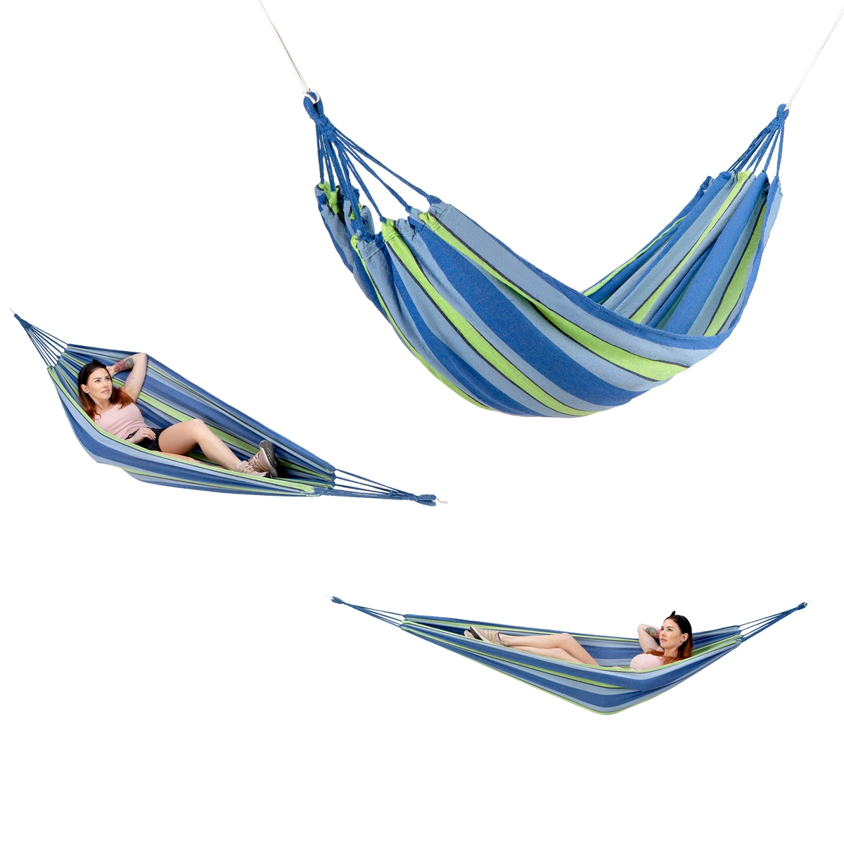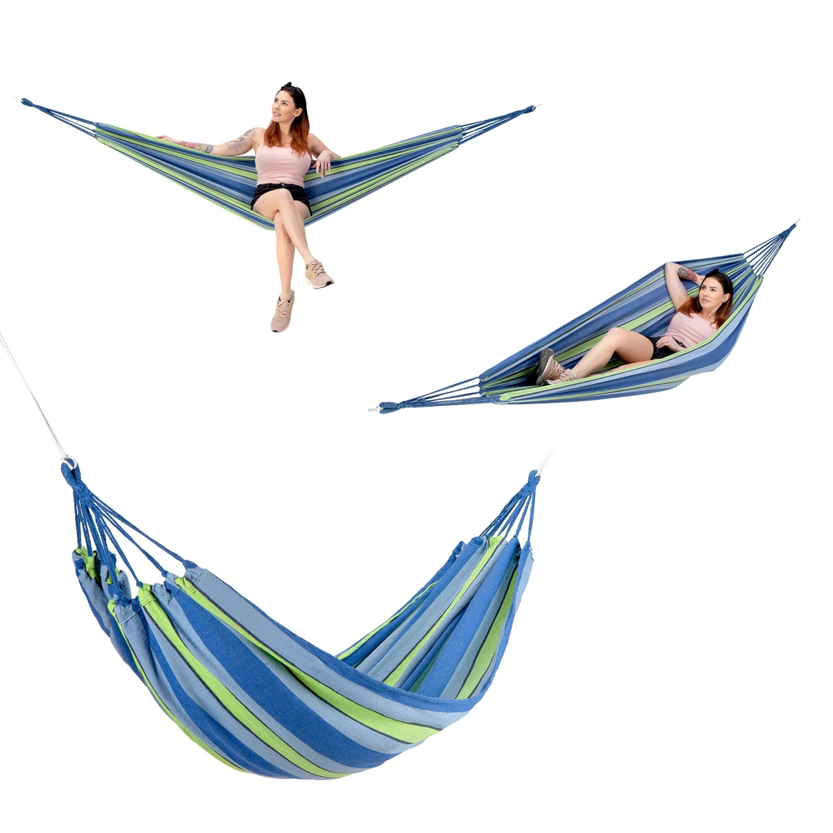 To hamak, przeznaczony do zawieszenia np. między dwoma drzewami. Łatwy w montażu, wszystkie niezbędne przybory, znajdują się w zestawie. Już po kilku chwilach, będziemy mogli oddać się, błogiemu odpoczynkowi. Hamak idealnie dopasuje się naszego ciała, a szerokość aż 120 cm gwarantuje każdemu, znalezienie wygodnej pozycji. Materiał hamaka to poliester oraz przyjemna, gęsto pleciona bawełna. Takie połączenie, daje bardzo wysoką wytrzymałość oraz odporność, na jakiekolwiek odkształcenie.