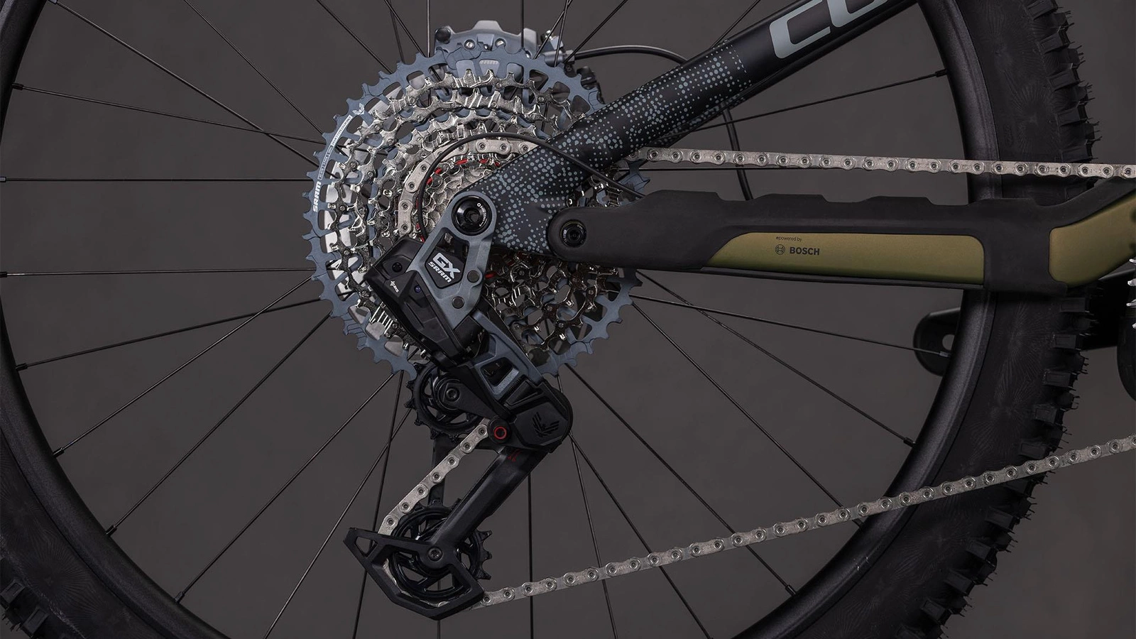 Napęd Bosch CX (100 Nm) z akumulatorem PowerTube 800 Wh połączony z elektroniczną, bezprzewodową przerzutką Sram GX Eagle AXS Transmission daje niezrównaną precyzję zmiany biegów i natychmiastową reakcję na każdy impuls. A zdalnie opuszczana sztyca zadba o płynny przepływ przez techniczne sekcje.